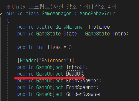 GameManager 스크립트에 DeadUI 변수를 선언하고 플레이어가 죽었을 때 활성화되도록 한다.