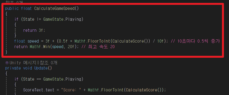 Game Manager 스크립트에 CalculateGameSpeed 메서드를 추가한다.