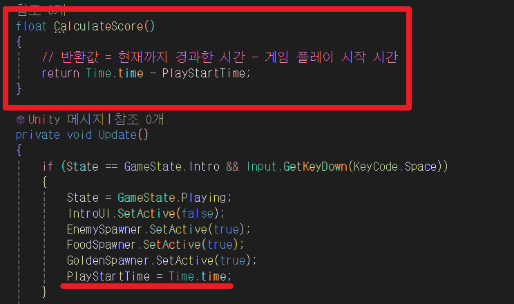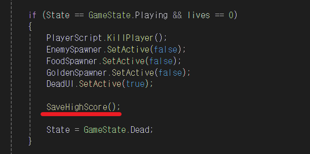 State가 Playing인 상태에서 죽었을 때 SaveHighScore 메서드를 통해 점수를 저장하는 걸 잊으면 안 된다.