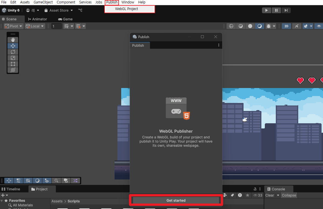 WebGL Project를 클릭하여 Get started를 누르고 Build and Publish를 누른다.