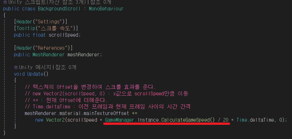 BackgroundScroll 스크립트에서 Update 메서드에 CalculateGameSpeed 메서드를 추가한다.