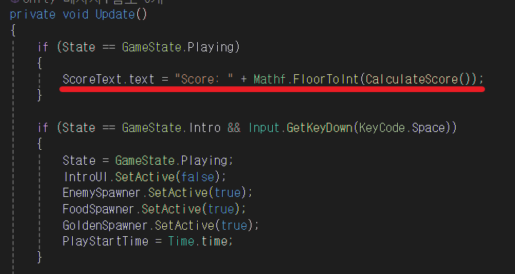 FloorToInt 메서드를 통해 현재 점수의 소수점을 버리고 정수로 변환하여 저장한다.