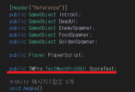추가한 텍스트를 변경하기 위해 GameManager 스크립트에 ScoreText 변수를 추가한다.