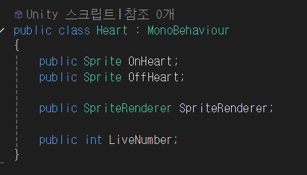 하트 이미지를 관리할 SpriteRenderer과 몇 번째 하트 오브젝트인지 알려주는 LiveNumber 변수를 선언한다.