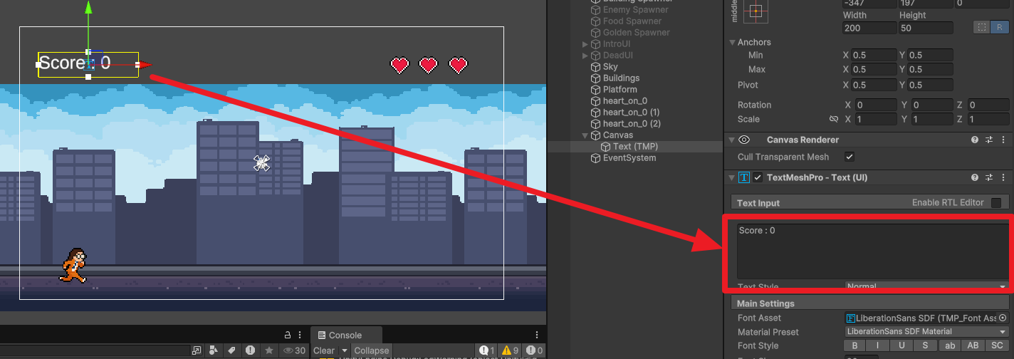 플레이어에게 점수를 보여주기 위해 UI -> Canvas를 만든다.