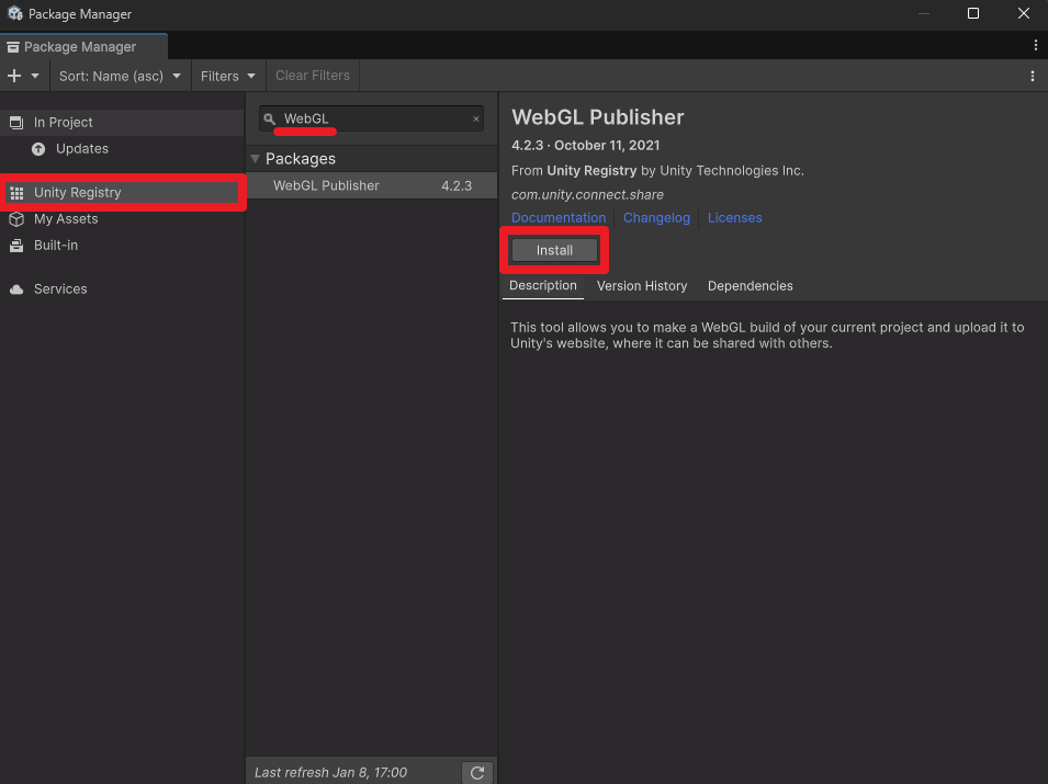 Window -> Package Manager 에서 Unity Registry를 누르고 WebGL 이라고 검색한다.