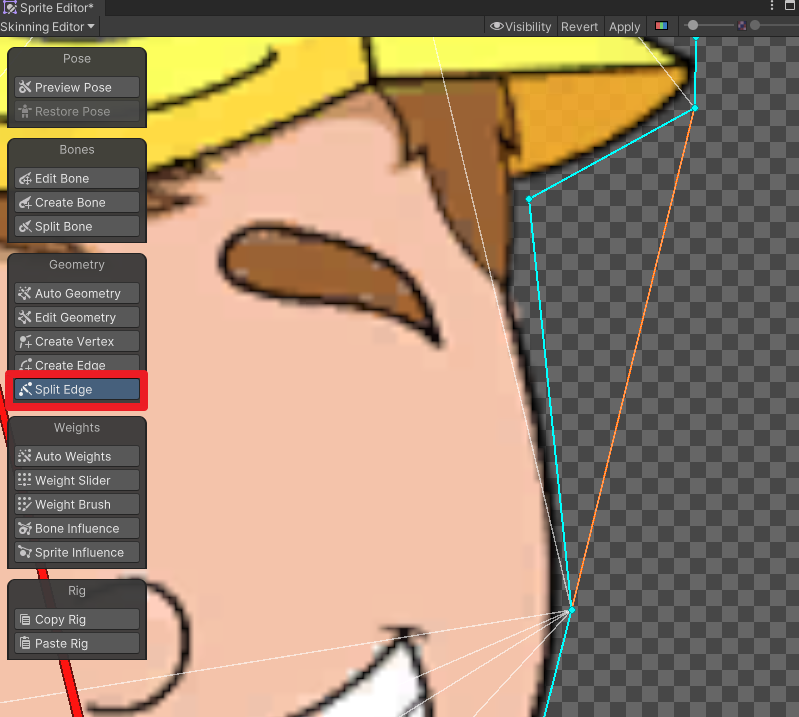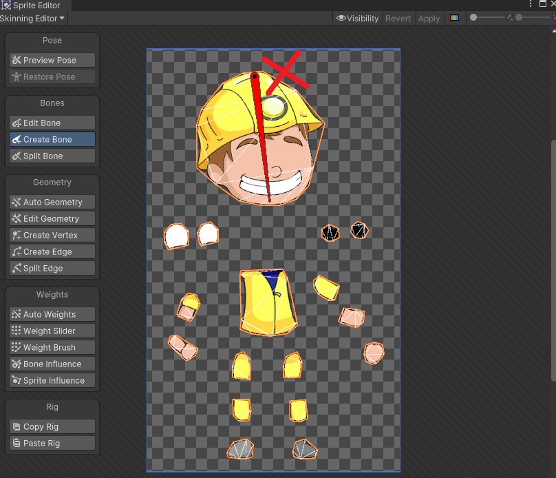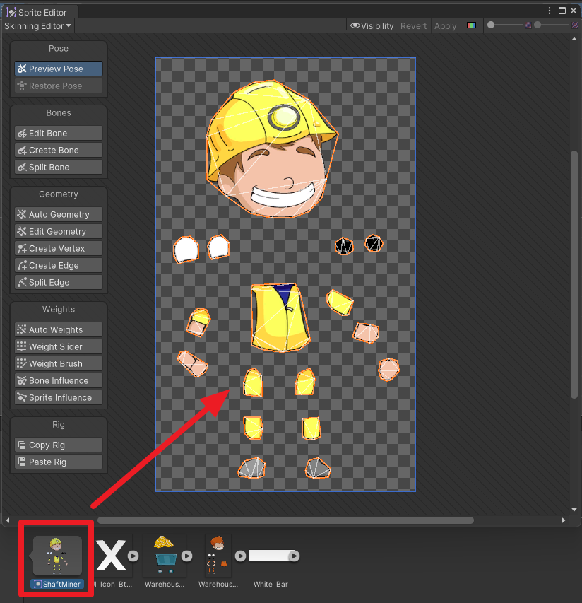 Skinning Editor로 바꾸고 스프라이트 이미지를 클릭하면 각 부분이 활성화된다.