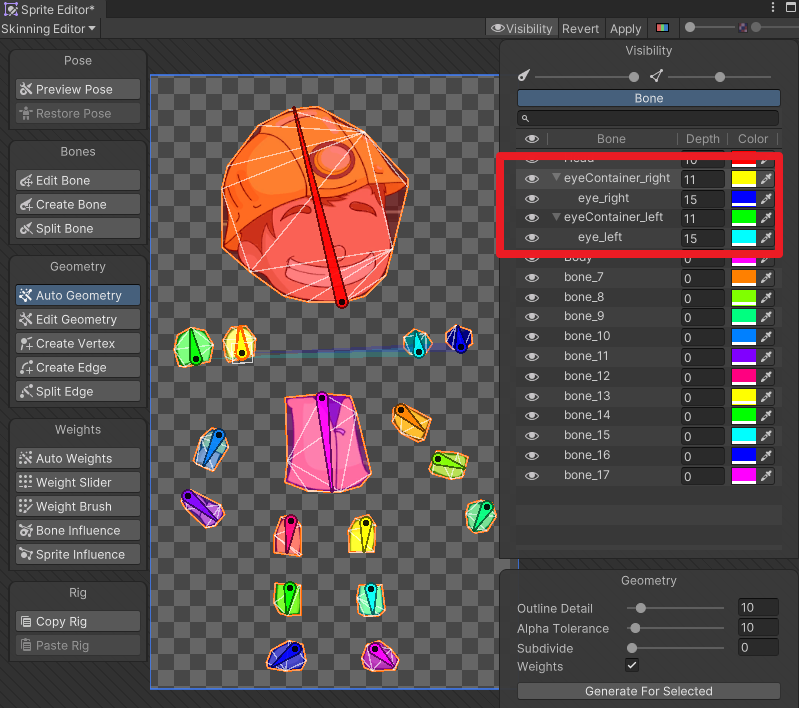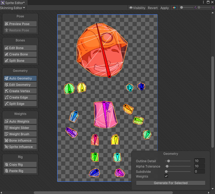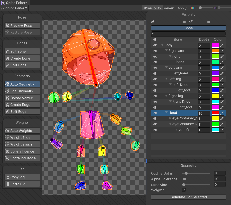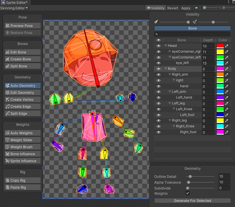 Generate For Selected 버튼을 누르면 뼈와 스프라이트를 연결한 모양이 생성된다.