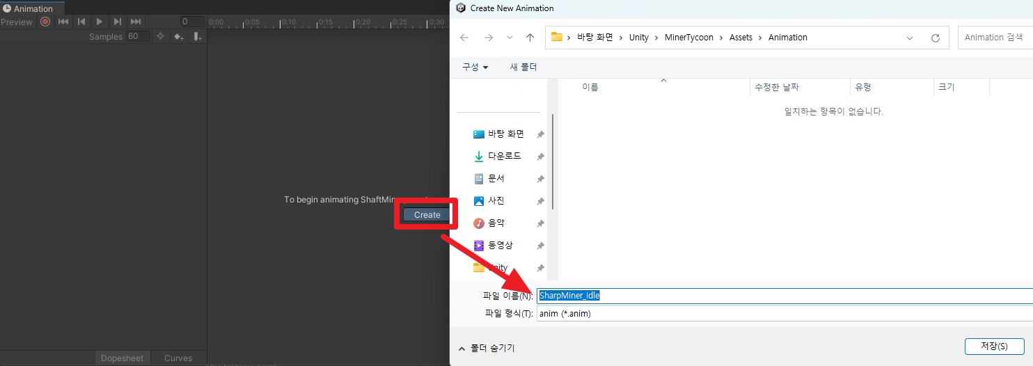 Create 버튼을 눌러 새로 만든 Animation 폴더에 SharpMiner_Idle로 저장한다.