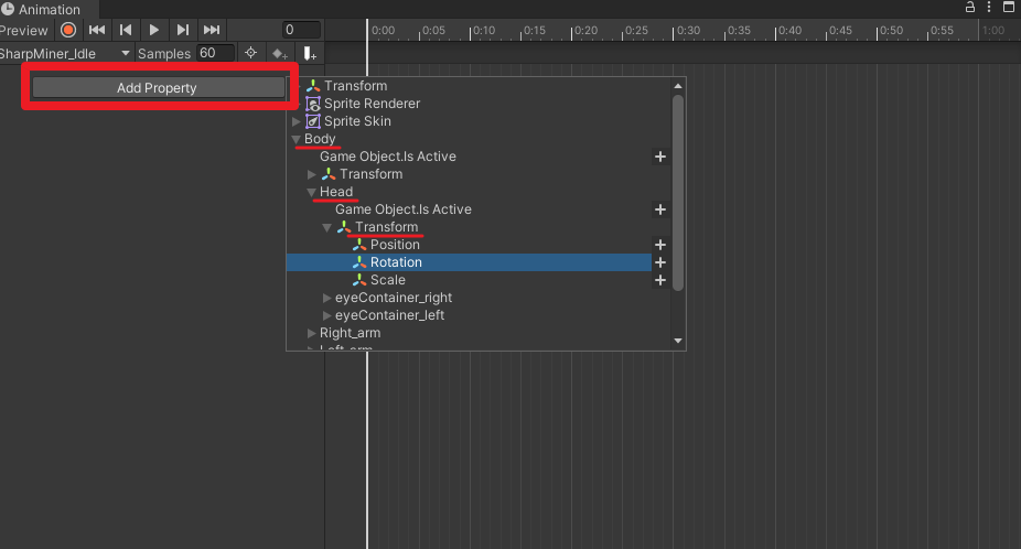 Add Property 버튼을 눌러 Body → Head → Transform → Rotation 을 추가한다.