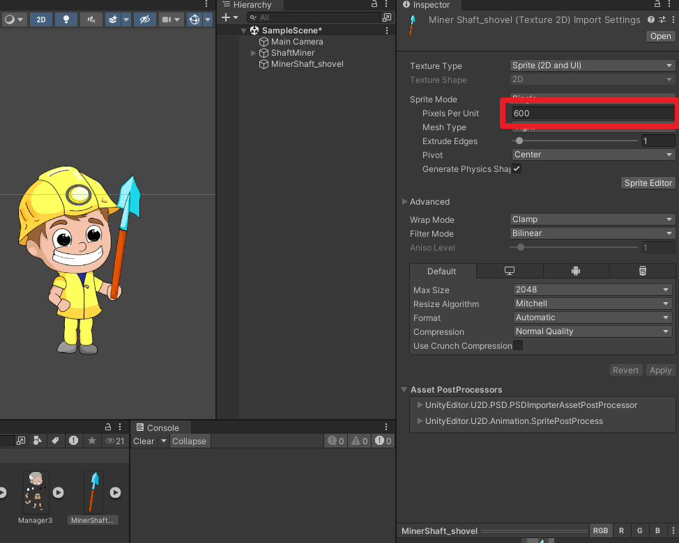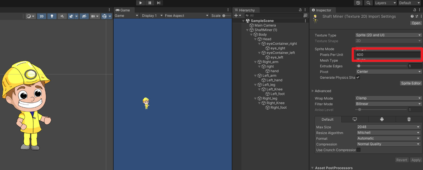 뼈를 이어 붙이기 전에 ShaftMiner 스프라이트의 Pixel Per Unit을 600으로 수정한다.