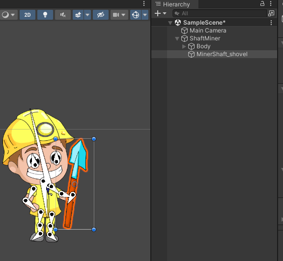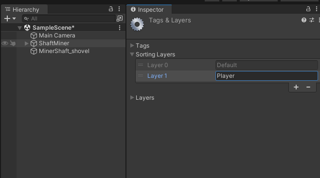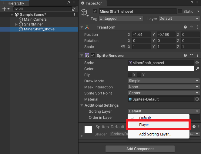광부와 삽의 Sorting Layer를 Default → Player로 변경한다.