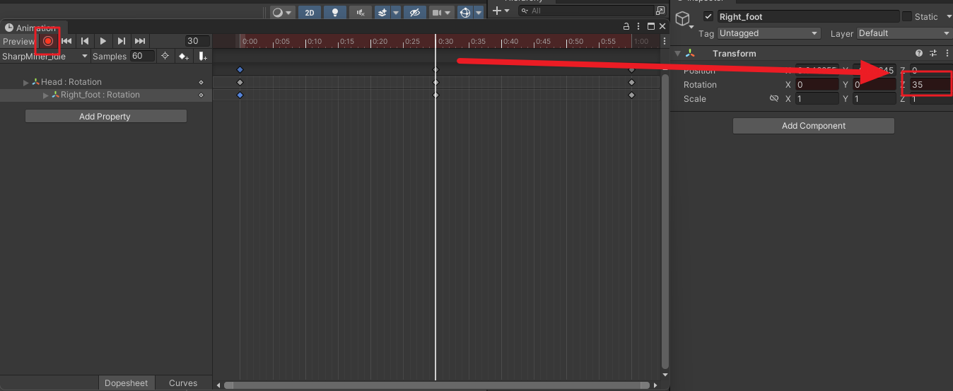 recording 버튼을 킨 상태로 Right_foot 의 Rotation Z축 값을 수정한다.