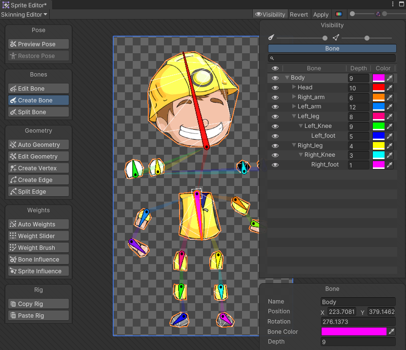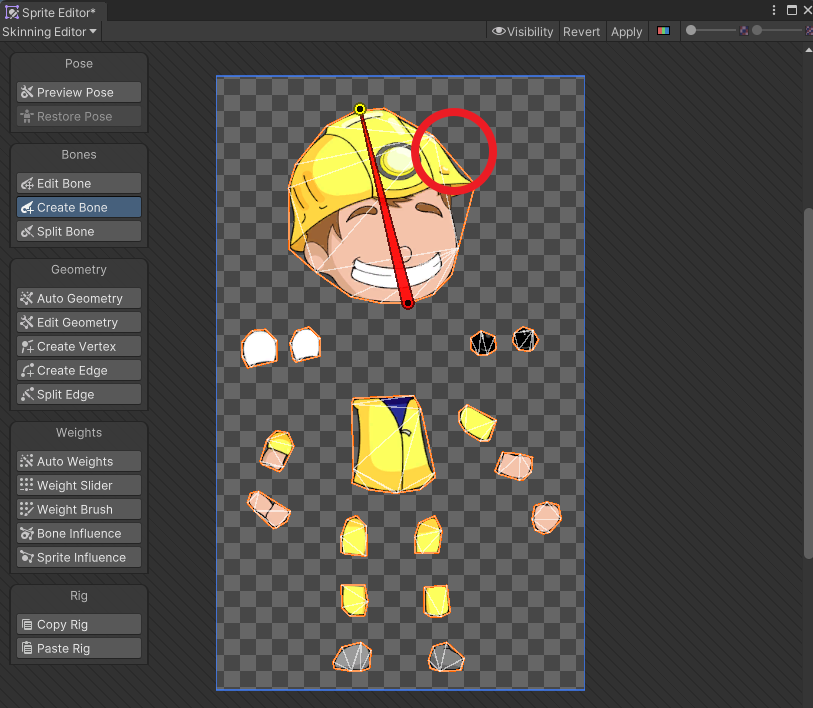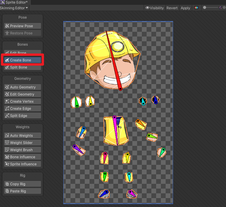 Sprite Skin 컴포넌트를 추가하고 Create Bones 버튼을 누른다.
