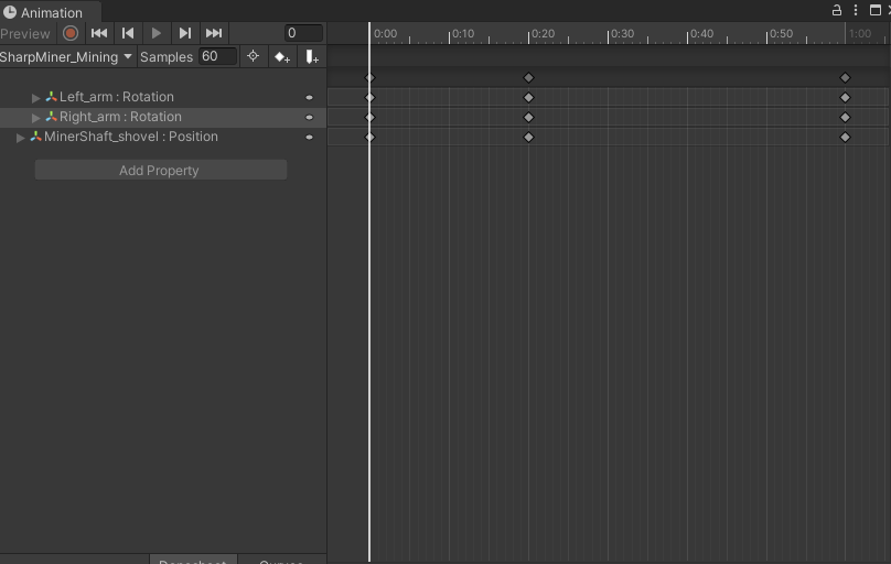 SharpMiner_Mining 애니메이션도 추가하여 Left_arm → Rotation, Right_arm → Rotation, 삽 → Position 3개를 추가했다.