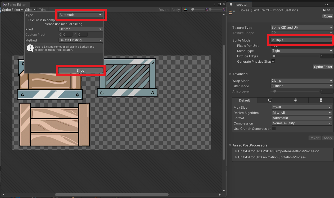 Boxes 스프라이트를 Multiple로 바꾸고 Automatic으로 Slice 한다.