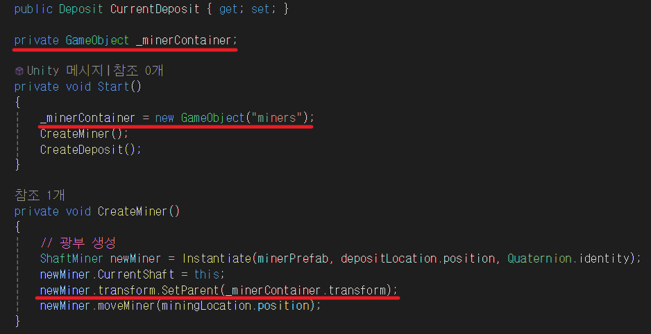 _minerContainer 변수를 선언하고 Start 메서드에서 새로운 오브젝트를 만들도록 한다.