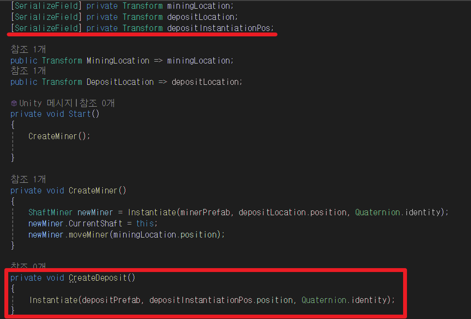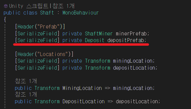 Shaft 스크립트에 SerializeField로 depositPrefab 변수를 추가하여 인스펙터에서 입금을 할 것이다.