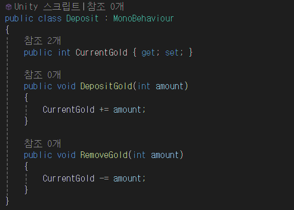 프로퍼티로 CurrentGold를 선언하고 DepositGold, RemoveGold 함수를 선언한다.