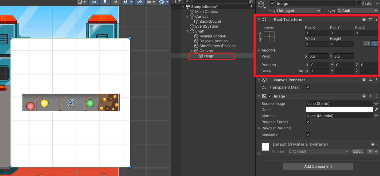 Canvas 안에 UI 이미지를 만들고 사이즈가 너무 크니 5, 5로 조정한다.