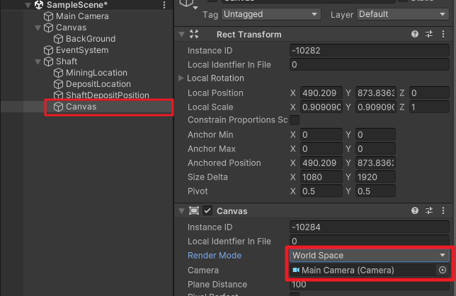 Shaft 안에 Canvas를 만들고 Render Mode를 World Space로 변경한다.