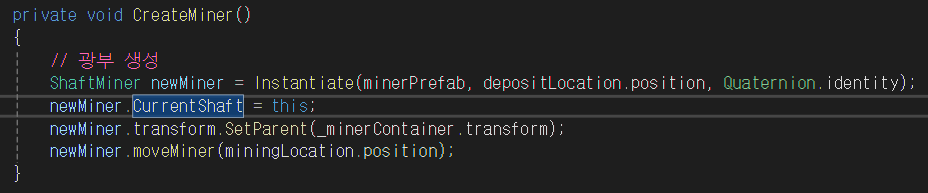 ShaftMiner 스크립트의 CurrentShaft는 광부가 이동할 장소를 알려주는데 필요하다.