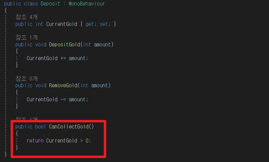Deposit 스크립트에 CanCollectGold 함수를 추가한다.