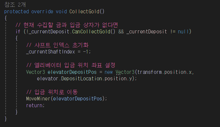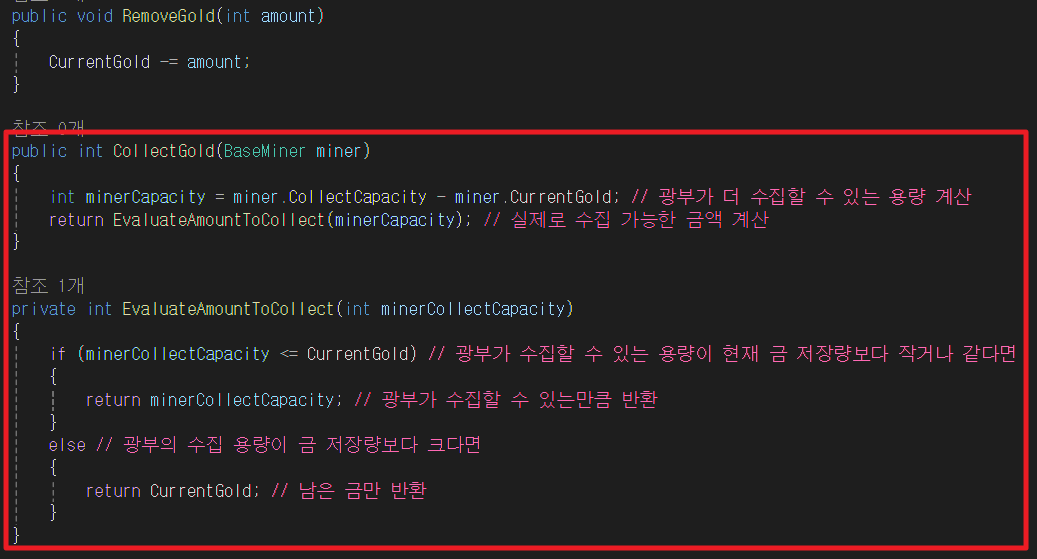 CollectGold 함수에서 광부의 용량을 고려하여 실제 수집 가능한 금액을 계산하고,