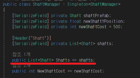 ShaftManager에서 private로 선언된 shaft 목록을 가져오기 위해 List로 Shafts 변수를 선언한다.