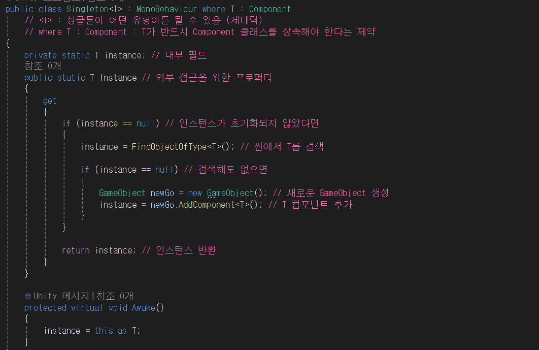 새로운 Singleton 스크립트를 만들어서 제네릭 싱글톤 패턴을 구현한다.
