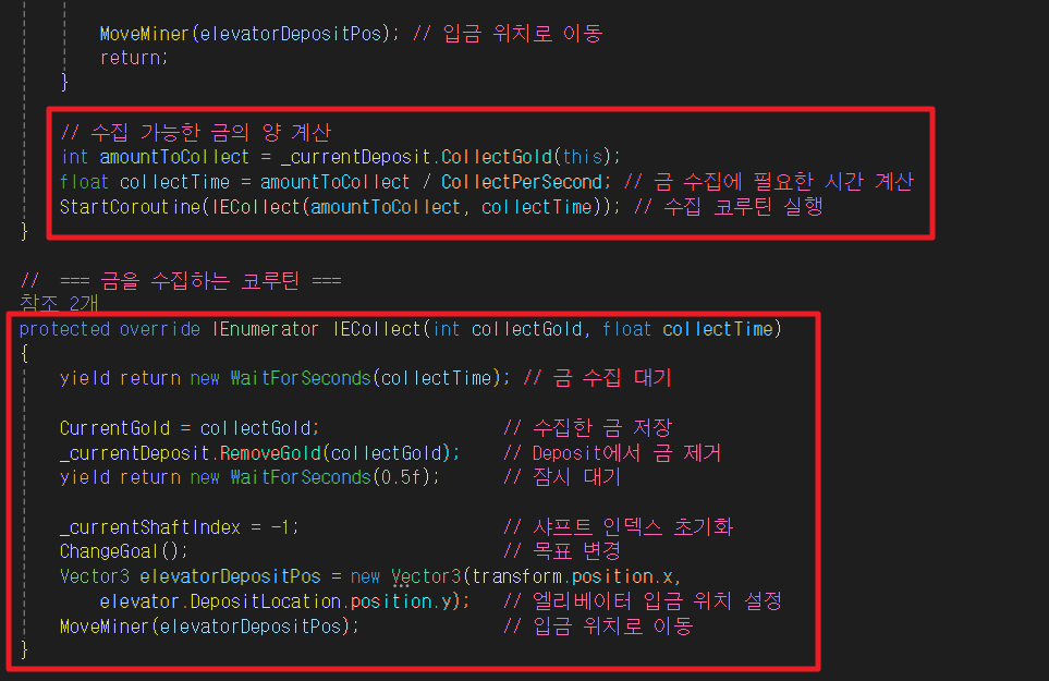 먼저 CollectGold에서 수집 가능한 금의 양을 계산하고 코루틴을 실행한다.
