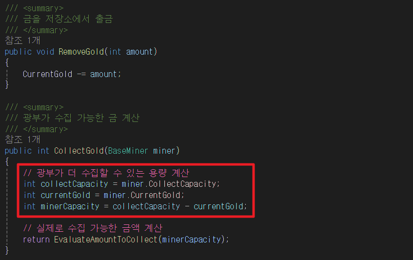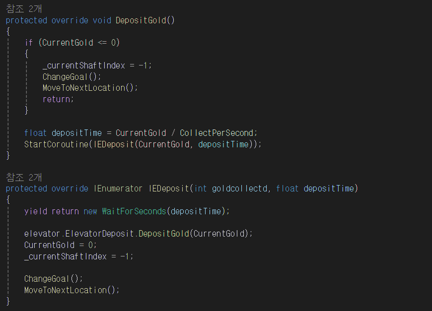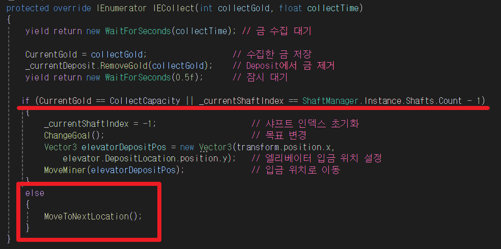 CollectGold 함수에서 ChangeGoal 함수를 호출해 수집 → 입금 상태로 전환한다.