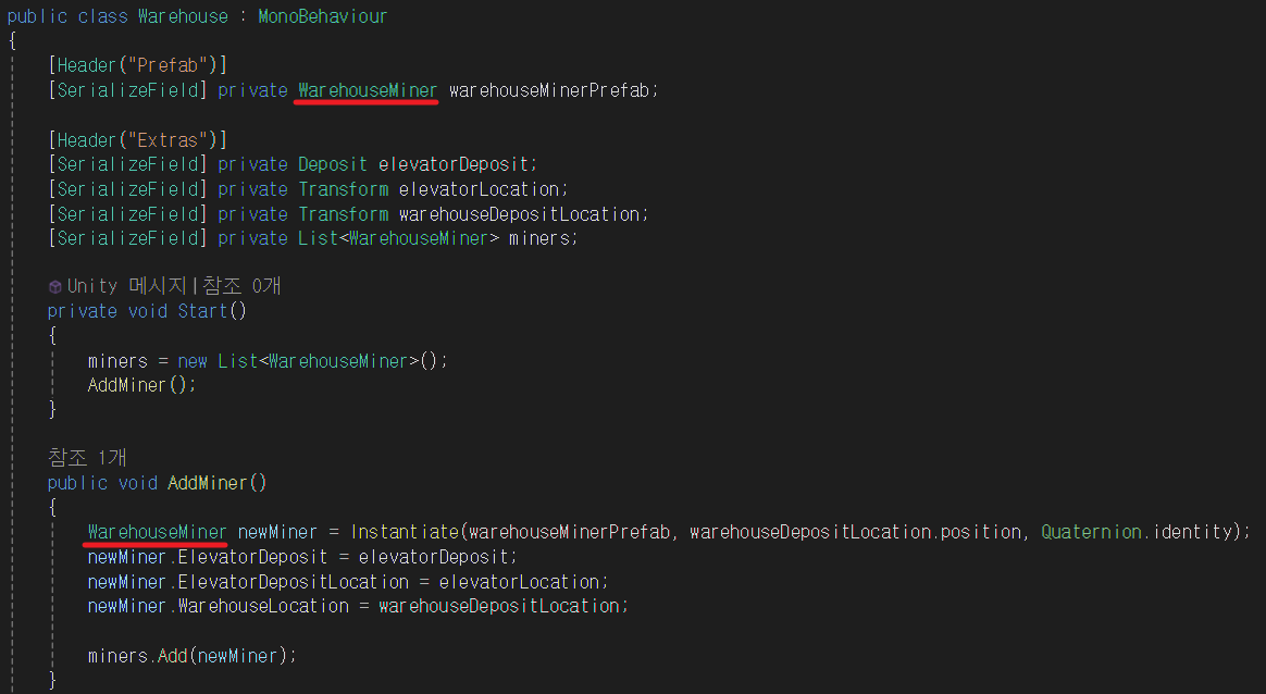 AddMiner 함수를 만들어서 GameObject로 newMiner를 만들고 GetComponent를 통해 WarehouseMiner를 가져왔다.