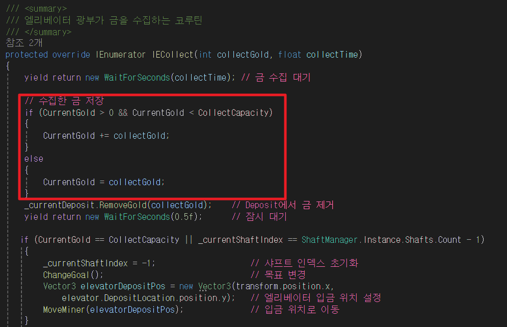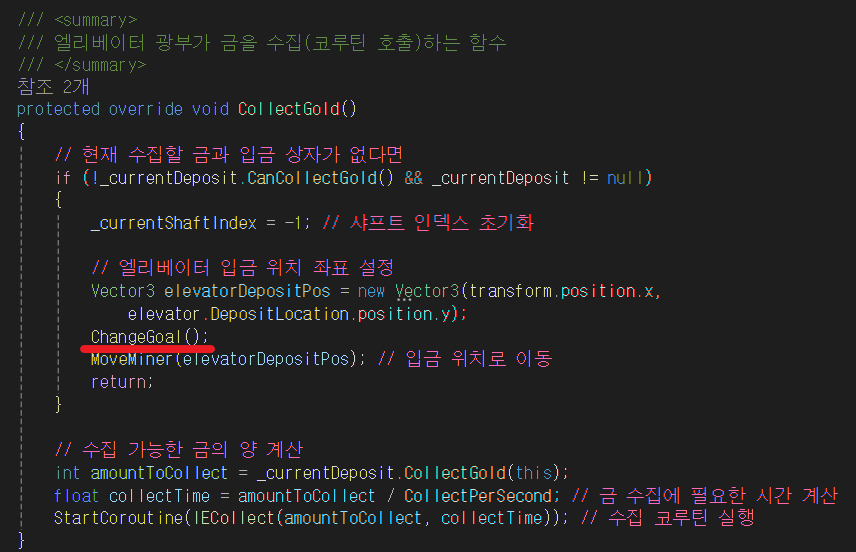 CollectGold 함수에서 ChangeGoal 함수를 호출해 수집 → 입금 상태로 전환한다.