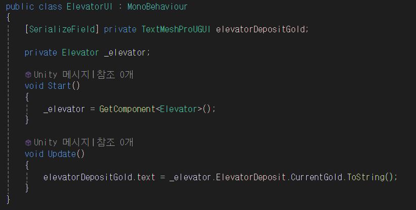 TextMeshProUGUI 클래스 변수와 Elevator 클래스 변수를 선언한다.