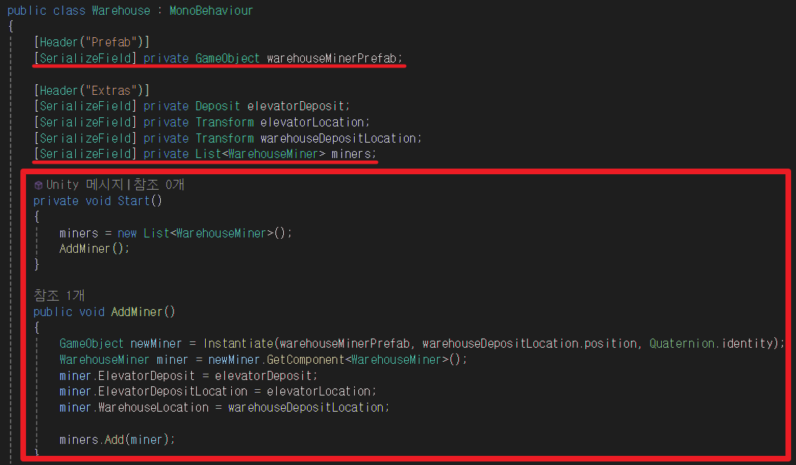 AddMiner 함수를 만들어서 GameObject로 newMiner를 만들고 GetComponent를 통해 WarehouseMiner를 가져왔다.