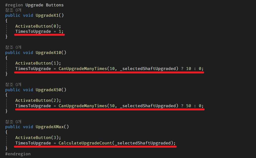 10, 50 버튼은 충분한 금액이 없으면 TimesToUpgrade가 0이 되고,