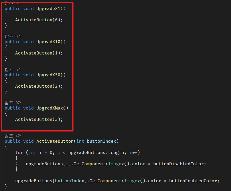 x1버튼은 그대로 1을 저장하고, x10과 x50버튼은 10번 업그레이드가 가능한지 여부를 가져와 삼항 연산자로 값을 저장한다.
