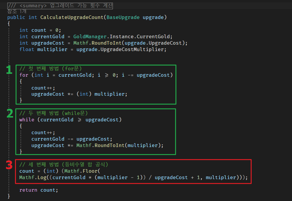 CalculateUpgradeCount 함수에서 계산한 count를 업그레이드 횟수와 비교하여