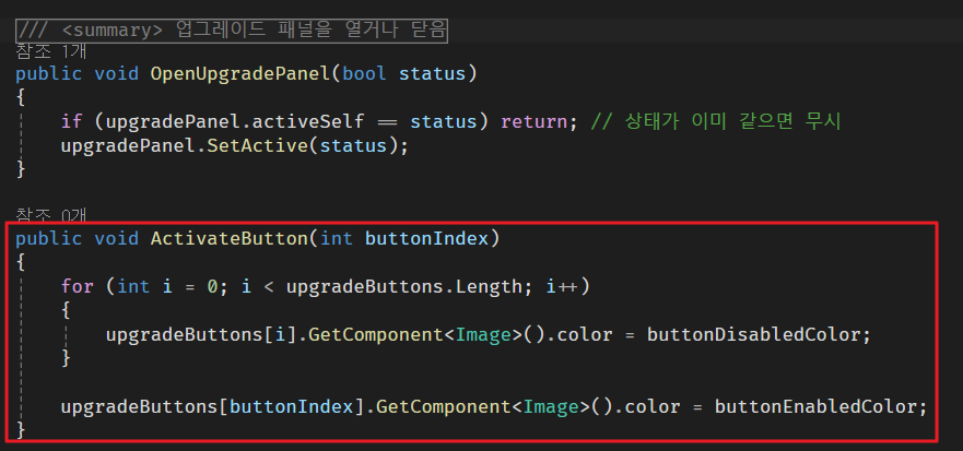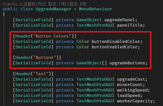 UpgradeManager에서 버튼의 Color 변수와 버튼 배열을 선언한다.