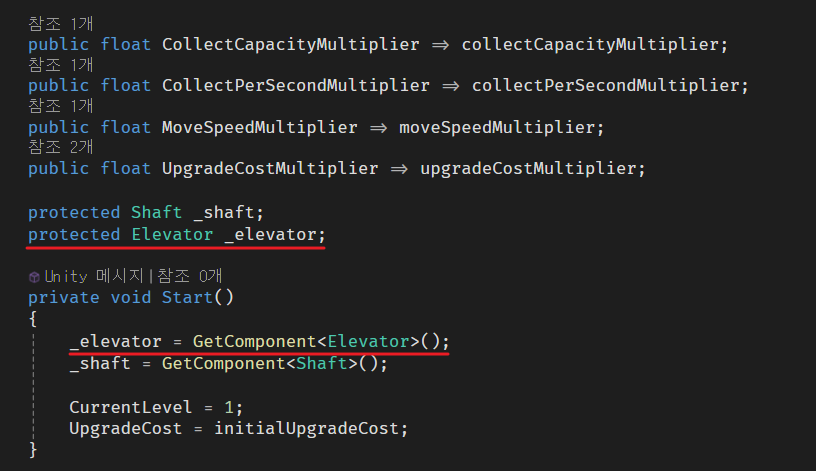 Start 메서드에서 GetComponent를 통해 가지고 있는 Elevator 스크립트를 가져와 초기화한다.