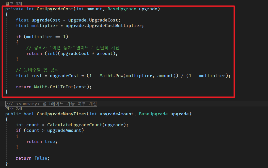 업그레이드 횟수를 받아서 업그레이드 비용이 얼마나 드는지 계산하는 GetUpgradeCost 함수도 만든다.