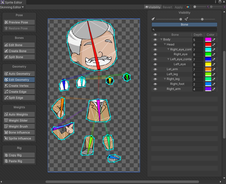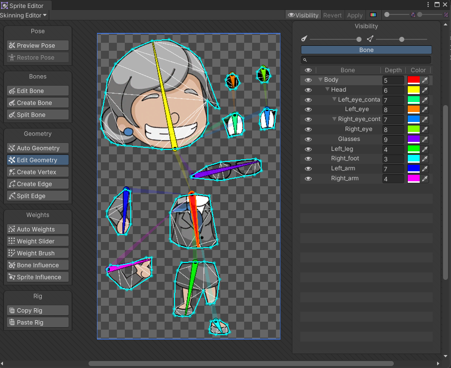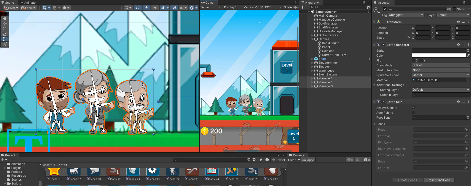 Skinning Editor에서 뼈를 만들어서 Sprite Skin 컴포넌트를 추가했다.