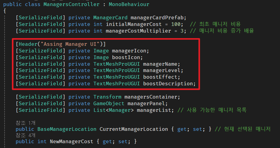 이제 고용되거나 고용되지 않은 매니저 모두 ManagerController 스크립트에서 참조하고 있다.