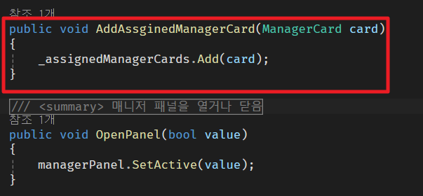 AddAssginedManagerCard 함수를 선언하고 파라미터로 ManagerCard를 받는다.