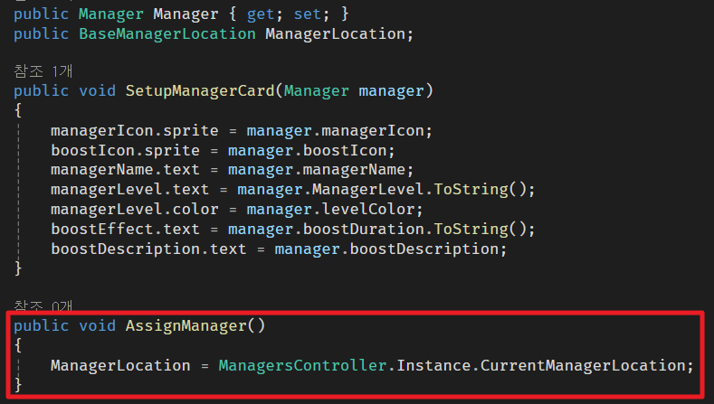 이제 ManagerCard 스크립트에서 AssignManager 함수를 만들고,
