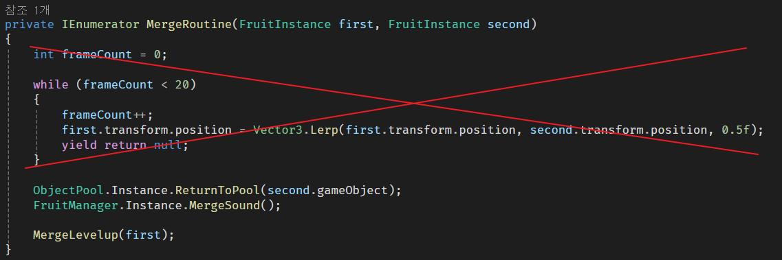 두 과일이 만나 병합될 때 부딪힌 객체로 부드럽게 이동하도록 Lerp 함수를 사용했었다.
