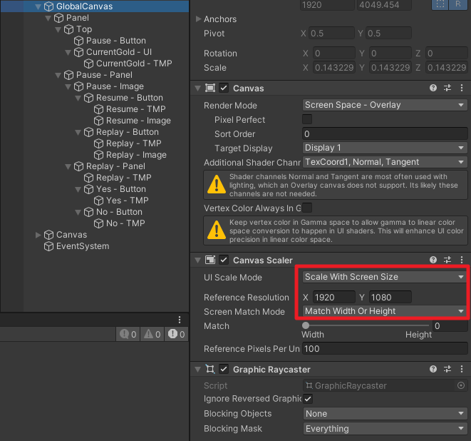 GlobalCanvas의 UI Scale Mode를 Scale With Screen Size로 설정했다.