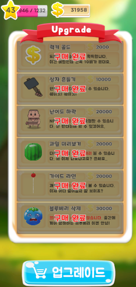 - upgradePurchased[]: 업그레이드 구매 여부를 저장하는 배열