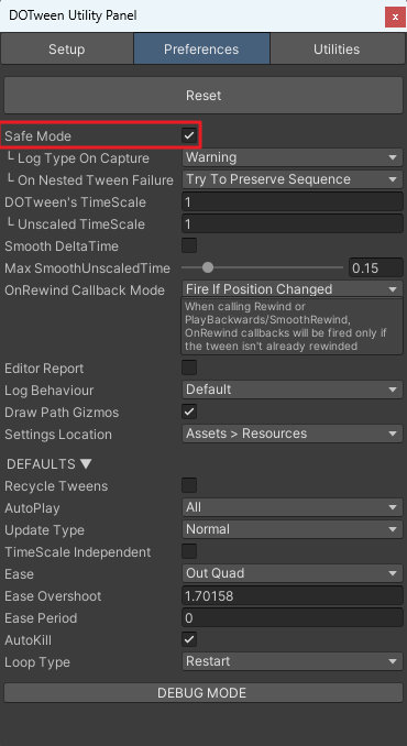 Tools → Demigiant → DoTween Utility Panel → Preferences에 Safe Mode가 체크 되어있다면